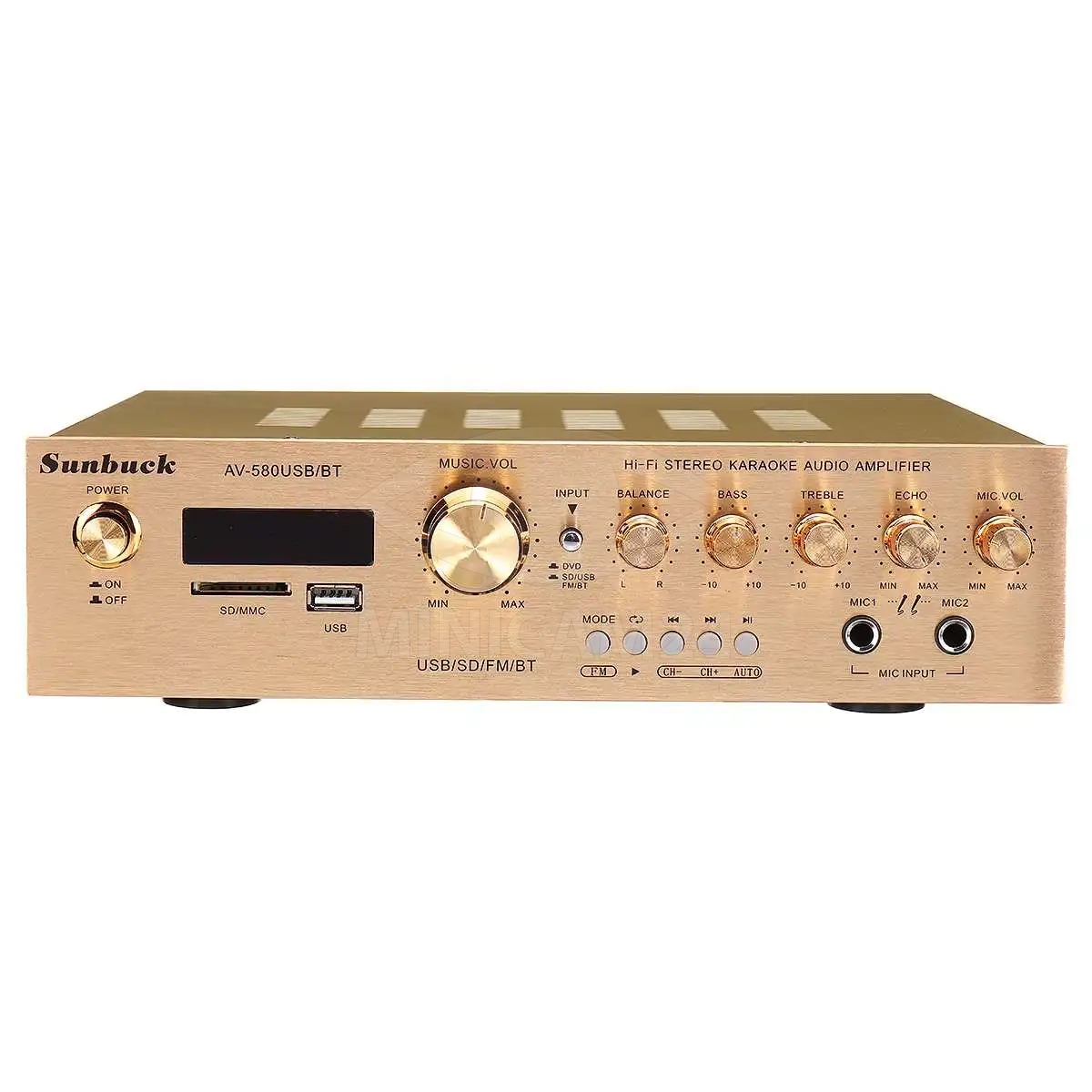 Пятиканальный Hi-Fi усилитель мощности Sunbuck AV-580USB/BT — идеальный выбор для создания мощной и качественной аудиосистемы. Он поддерживает объемный звук и оснащен модулем Bluetooth, FM-радио, а также возможностью воспроизведения аудиофайлов с SD-карт и USB-флешек. Встроенная функция караоке позволяет подключать два микрофона, каждый из которых имеет регулировку громкости и эффект реверберации для создания эффекта эха.