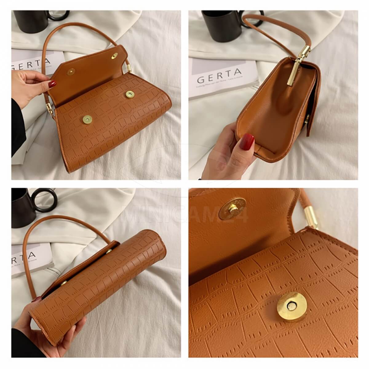 Сумка-багет женская Stella коричневая в форме трапеции – идеальный вариант для выхода на праздничные мероприятия и ежедневной носки. Сумка женская выполнена из белой экологической кожи, которая не требует особого ухода. Мягкая экокожа хорошо переносит холод и жару, не трескается в минусовую температуру, не выцветает под действием ультрафиолета и не боится дождя или снега. Сумка через плечо имеет прочный каркас, поэтому не теряет своей формы. Клапан застегивается на магнитные замки. Длина ручек не регулируется. Прочная хлопковая подкладка не разрывается из-за острых предметов. Внутри сумки-багета есть объемный отсек и небольшой кармашек на молнии для мелочей.